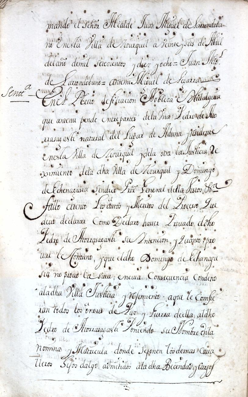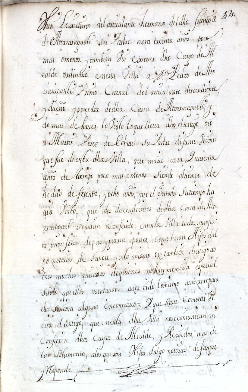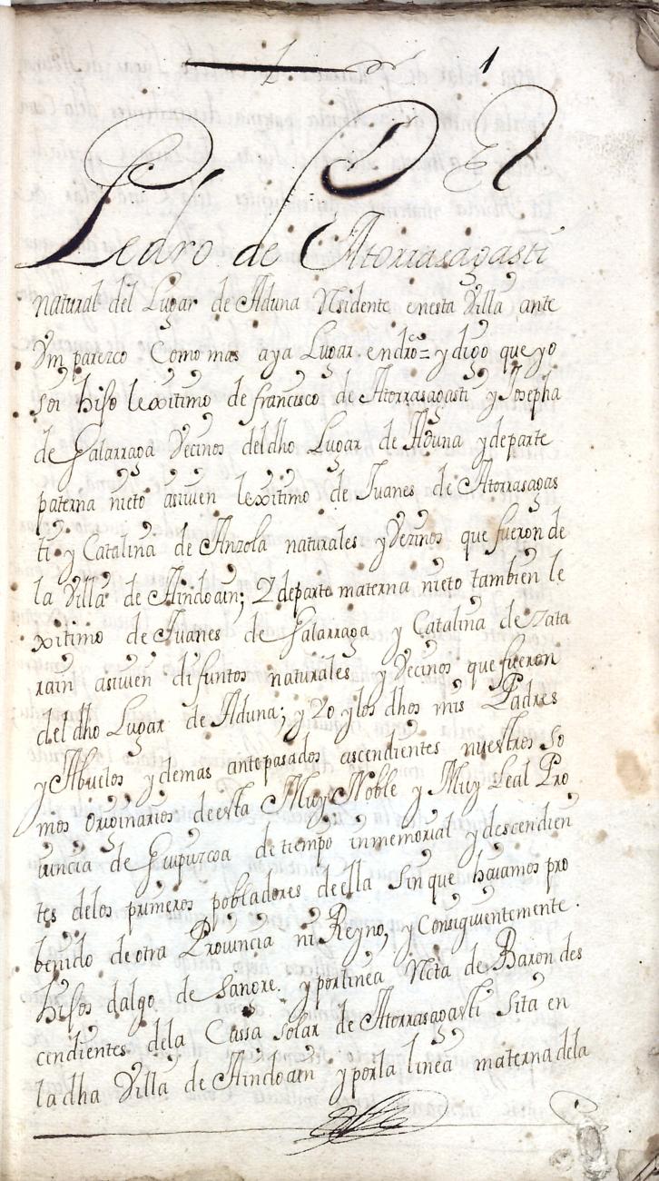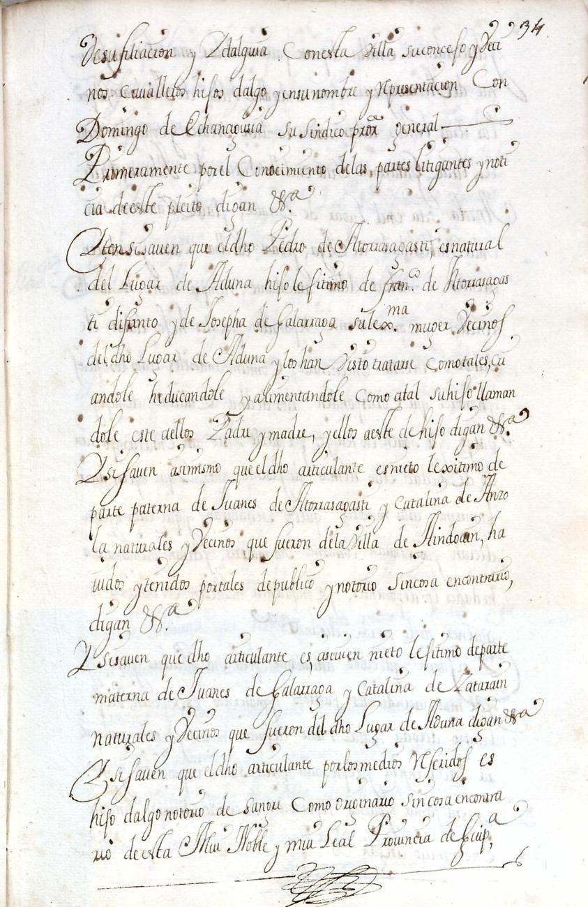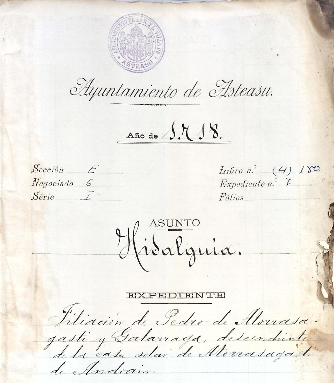 Hidalguias. Filiación de Pedro de Atorrasagasti y Galarraga, descendiente de la casa solar de Atorrasagasti de Andoain.